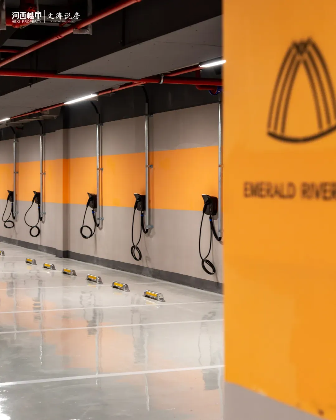 据悉,小区外立面升级为铝板,大面积玻璃和铝合金线条,设计偏现代,窗墙比较高。↓↓地下车库整体颜色鲜明亮堂,部分区域车位安装有充电桩,地面为金属材质的车轮挡轮器、环氧地坪,更经久耐用。↓↓