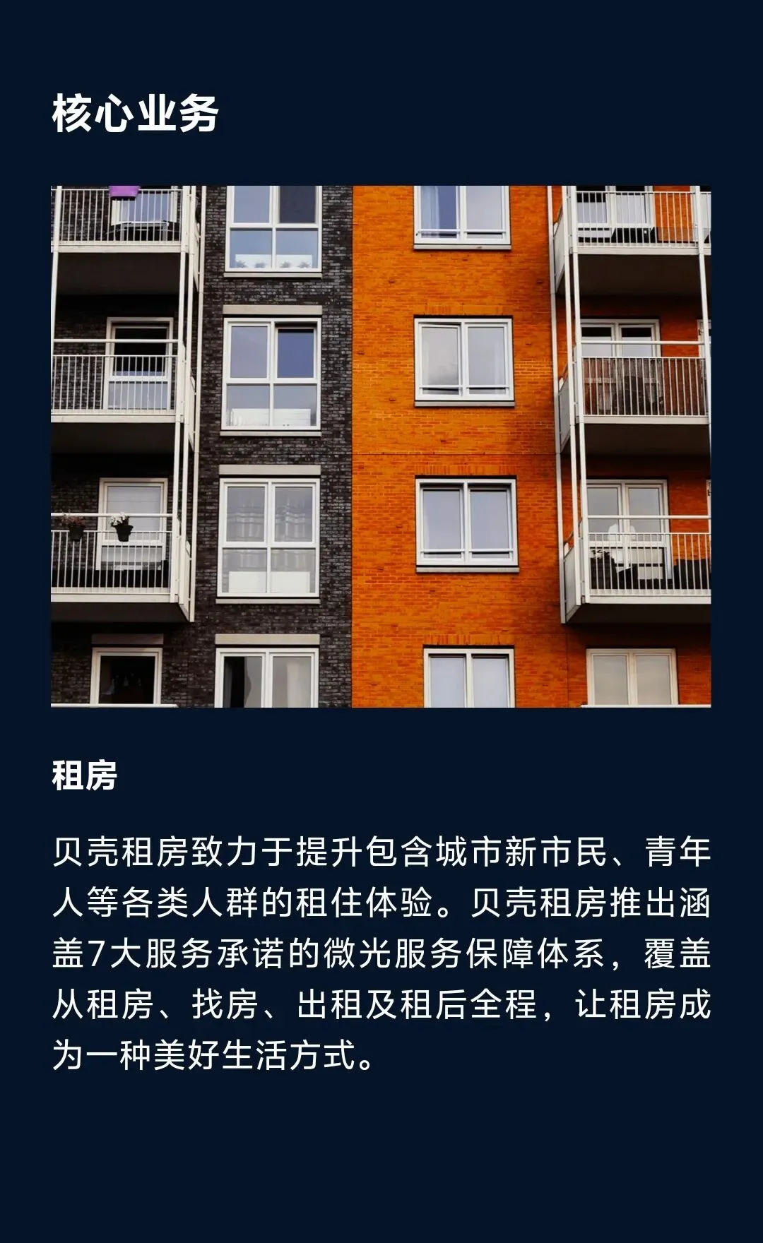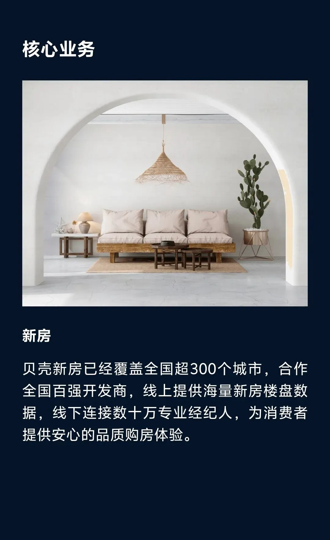 作为居住产业数字化服务平台,贝壳致力于推进居住服务的产业数字化、智能化进程,通过聚合、助力优质服务者,为中国家庭提供包括二手房交易、新房交易、租赁、家装、家居、家服等一站式、高品质、高效率服务,实现“对消费者好、帮助服务者对消费者好”。
