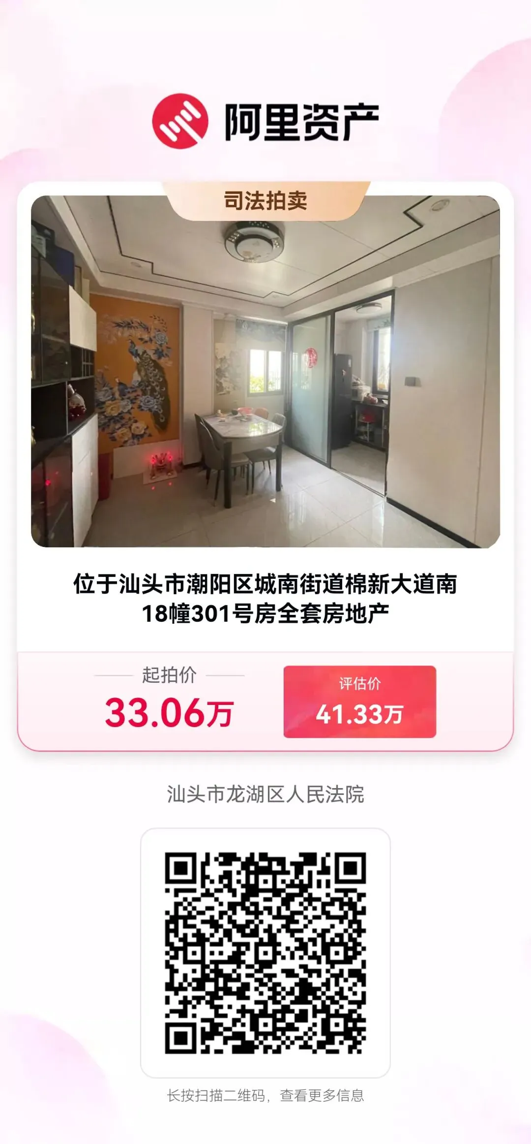汕头市潮阳区城南街道棉新大道南18幢301号房全套房地产【权证书号:粤(2023)潮阳区不动产权第0003509号】,房产面积:103.33㎡。