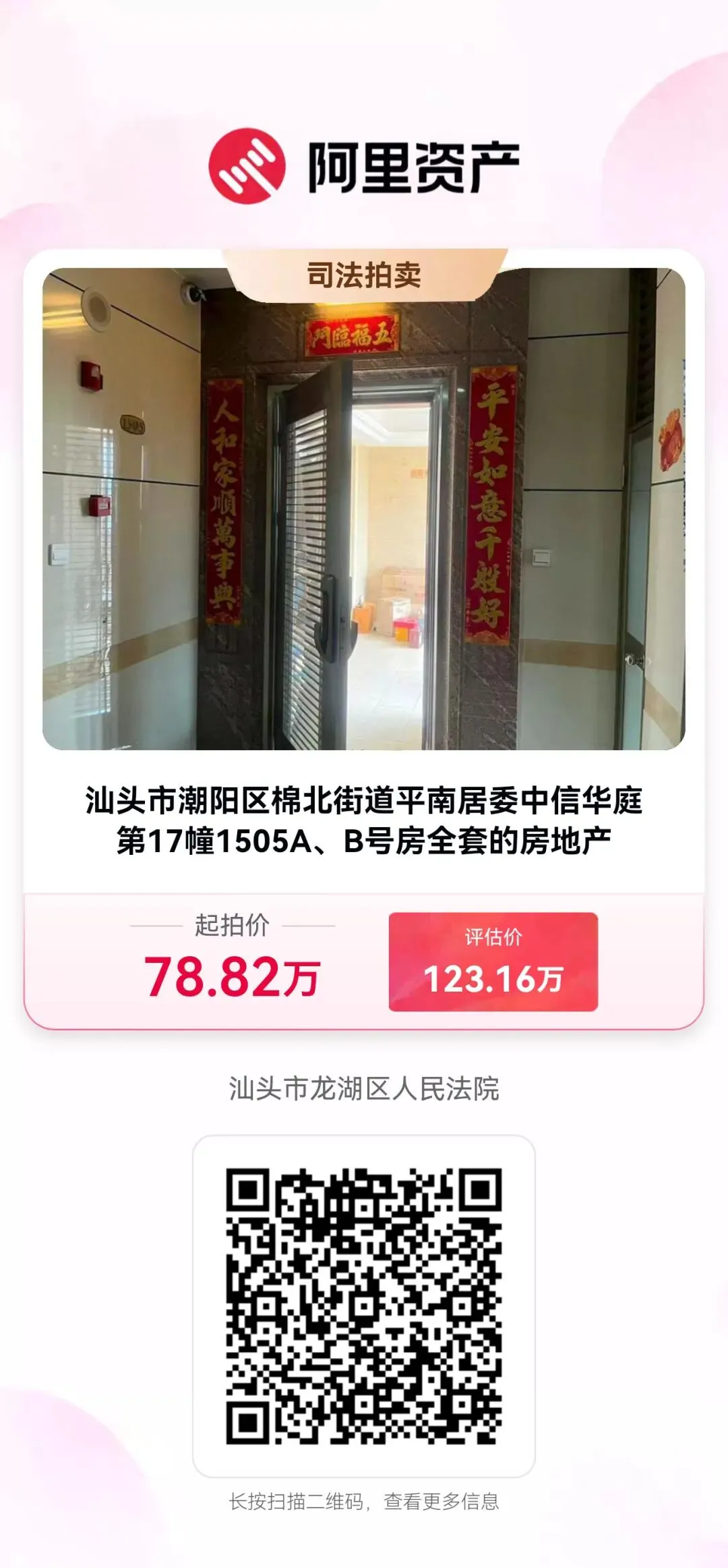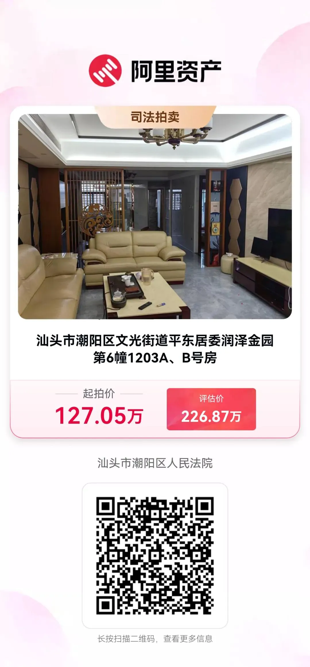 汕头市潮阳区文光街道平东居委润泽金园第6幢1203A、B号房【权证书号:粤(2021)潮阳区不动产权第0013162号,粤(2021)潮阳区不动产权第0013166号】,上述房产为捆绑拍卖,房产面积:168.43 ㎡。