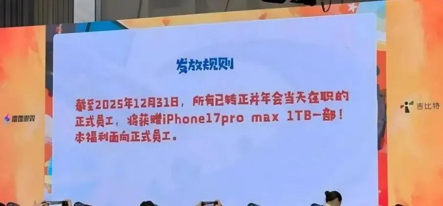 近日,“游戏茅”吉比特(603444 SH)及其子公司雷霆游戏的年会现场照片在社交平台上广泛传播。照片显示,公司所有已转正且年会当天在职的正式员工,都将获赠一台iPhone 17 Pro Max手机。有消息称,在本次年会上,吉比特旗下游戏《杖剑传说》的主策划林笋获得了一套价值千万的房产,此事还一度登上热搜。