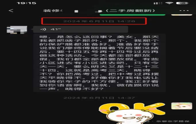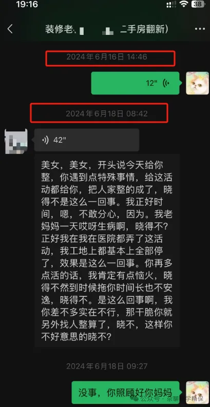 听到他这么有底气的语音回复,我和老公之前还悬着的心,一下就放松了。心想,终于守得云开见月明了!没想到,第二天上午,老板发来了语音告知我:让我通融他个把星期,因为他那边要先赶两套房子的活路,给我打声招呼。我要是同意的话最好,要是不同意的话只能找别人了……