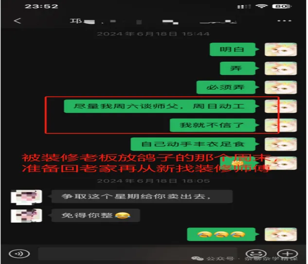终于在六月十八日的时候,迎来了大结局!老板开始不接我电话不回我微信,最后以自己老母亲生病为由,拒绝为我们老房装修了……