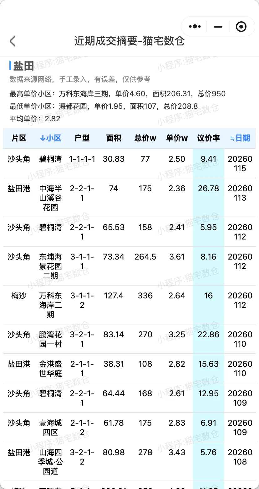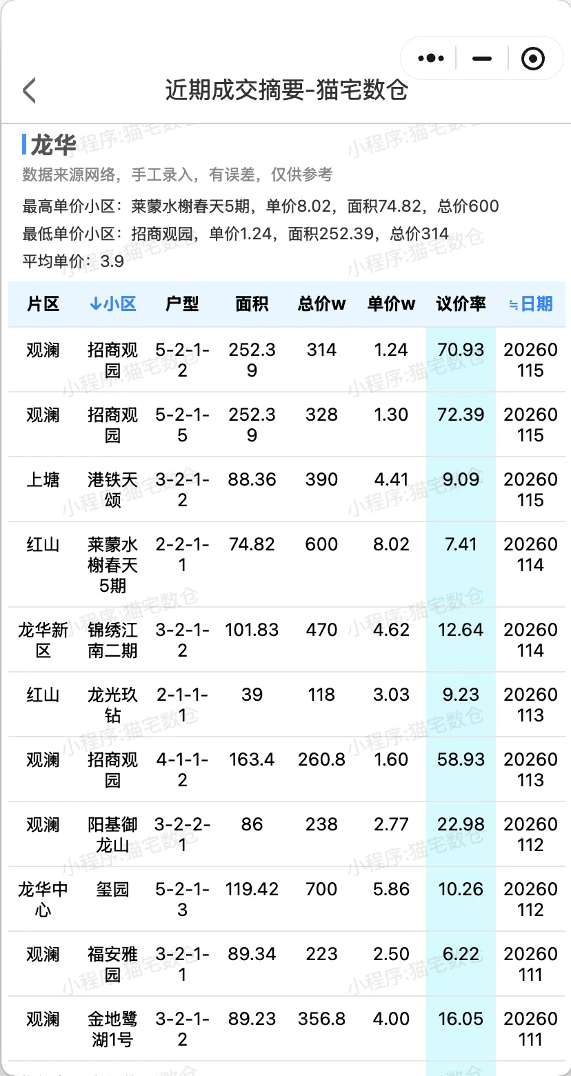 最低单价小区:招商观园,单价1.24,面积252.39,总价314