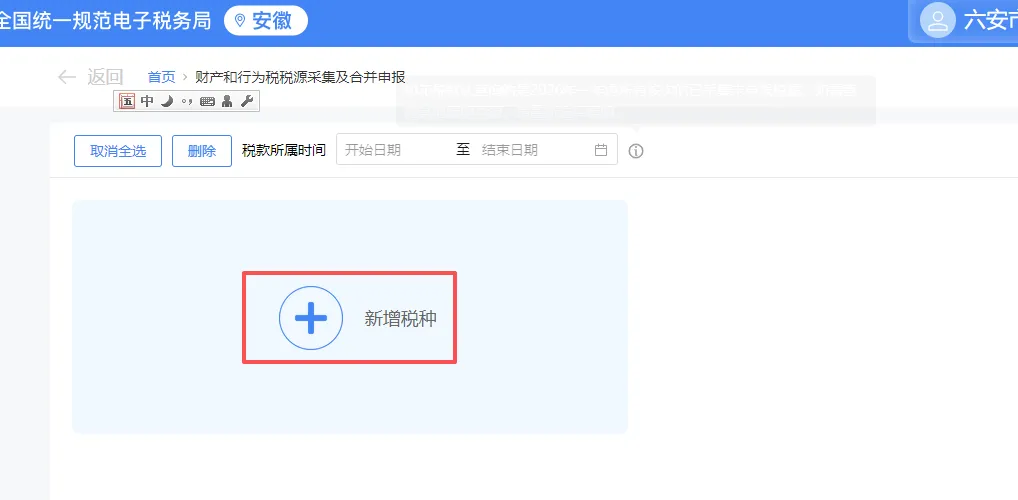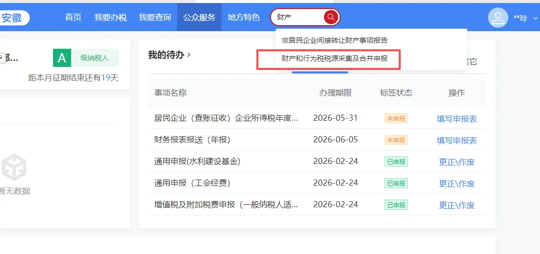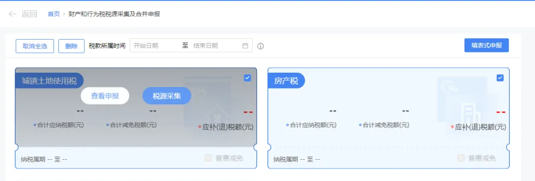 1.[我要办税】-[税费申报及缴纳】-[财产和行为税申报】-【财产和行为税税源采集及合并申报】功能菜单。或者首页端-搜索-财产,点击跳转到财产和行为税税源采集及合并申报里也行。