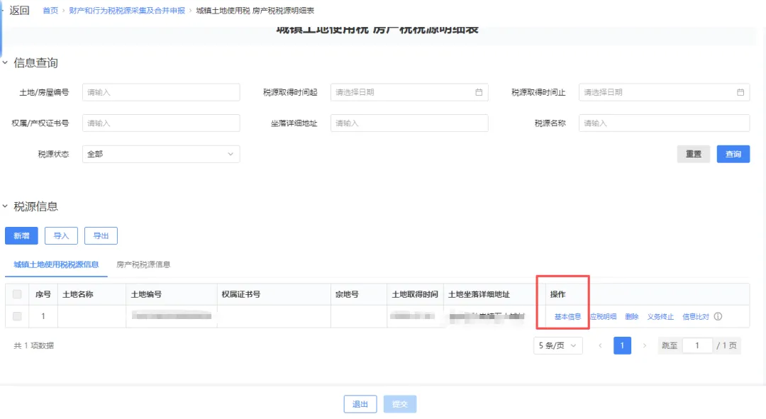 4.录入不动产单元号属于修改税源基本信息,城镇土地使用税、房产税操作相同。以城镇土地使用税为例: