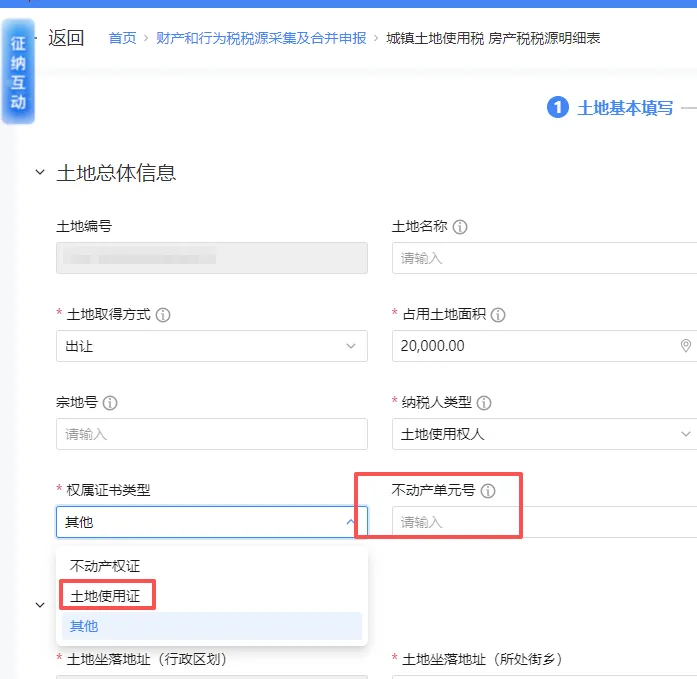 当[权属证书类型】选择“土地使用证”时,系统不动产单元号虽然提示为非必填项,但税管员现在通知填所以还得填。可填写28位字符,权属证书号为必填项,需按照证书所载全部录入。