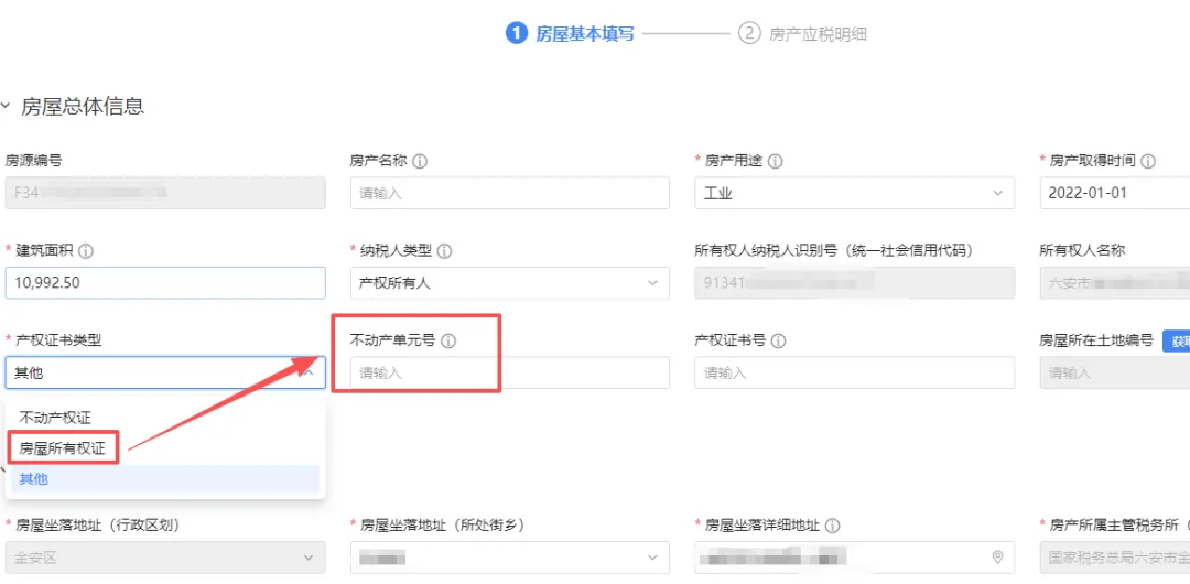 当[权属证书类型]选择“其他”时,不动产单元号和权属证书号为非必填项,请取得证书后进行录入。