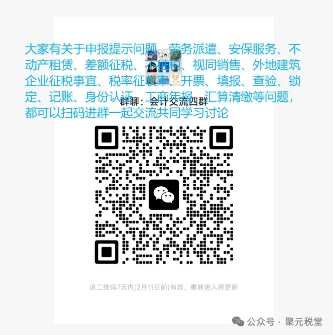 大家有关于申报提示问题、劳务派遣、安保服务、不动产租赁、差额征税、不征税、视同销售、外地建筑企业征税事宜、税率征收率、开票、填报、查验、锁定、记账、身份认证、工商年报、汇算清缴等财税方面问题,都可以扫码进群一起交流共同学习讨论。在会计群里也会有会计大咖们不时给大家分享实用资料,如果大家有需要什么资料的也可@群管人员帮忙找。