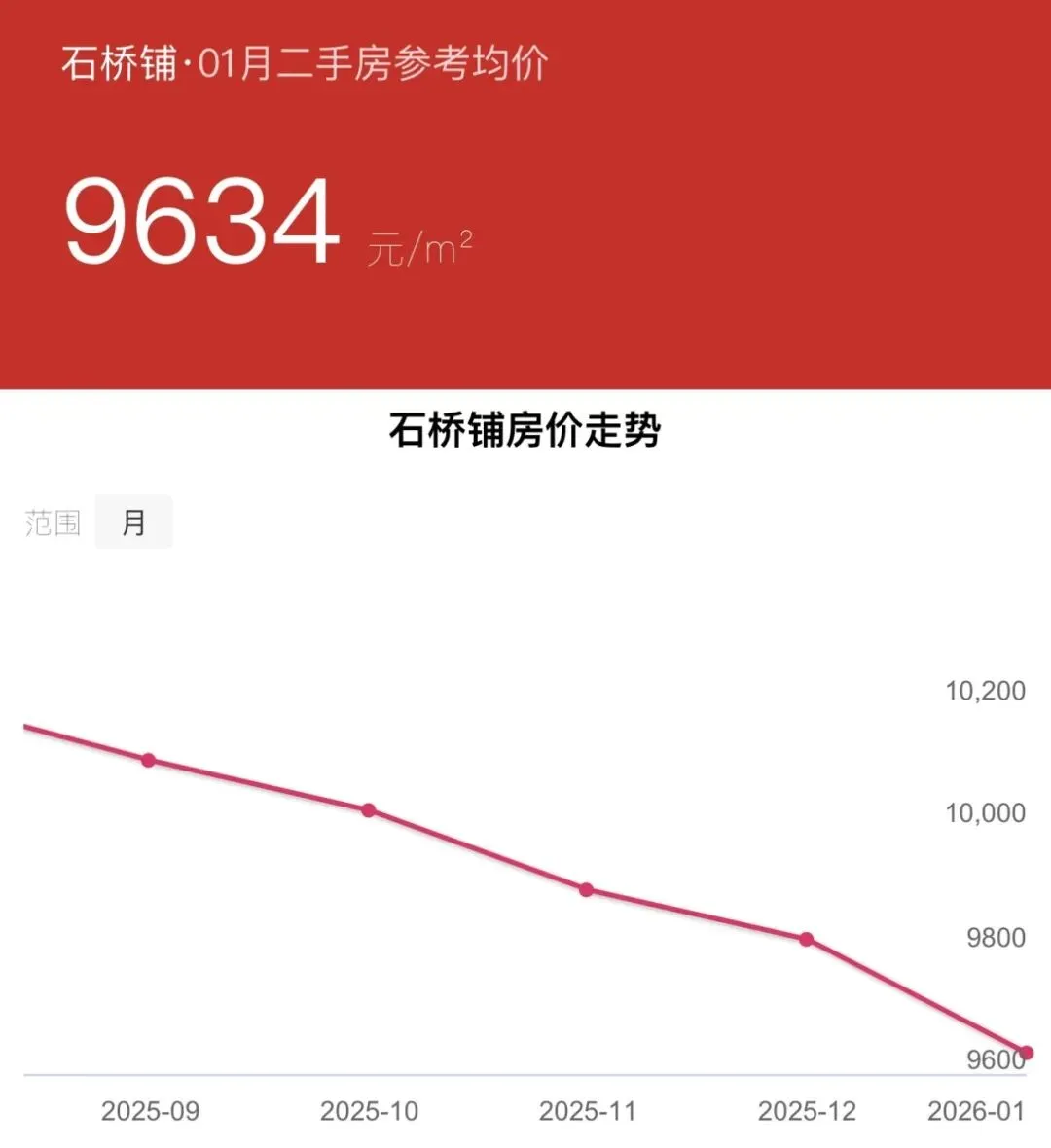 石桥铺,1月份二手房参考均价为9634元/平米。