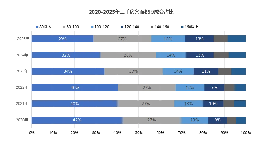 我们再从面积段来看,100平方米以下房源仍占据55%的市场主力地位。