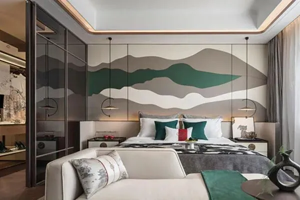 来到了卧室空间。在卧室落脚的时候,我们就瞬时爱上了这个休憩的空间了。设计师Myra以新中式风格为主导,灰,白,绿作为了主色调。在一张舒展尔雅的大床,精致考究的橱柜,中式浓情的床头墙,和典雅精巧的床尾凳的组合下,让这间面积适中的卧室里,洋溢着温煦浪漫的韵味了。当微风拂过,水波兴起,让人好似告别了都市的喧哗,瞬间来到了静谧之处,让身心压力皆被释放了。这间淡雅的卧室里,传递出了现代设计的善意,它彷如是设计师Myra生花一笔,一笔点睛了,俨然伫立了家的舒怡感,转译了家的舒欣之感了。回到卧室,Harmony就如同回到了母亲子宫般的安全与安定了。