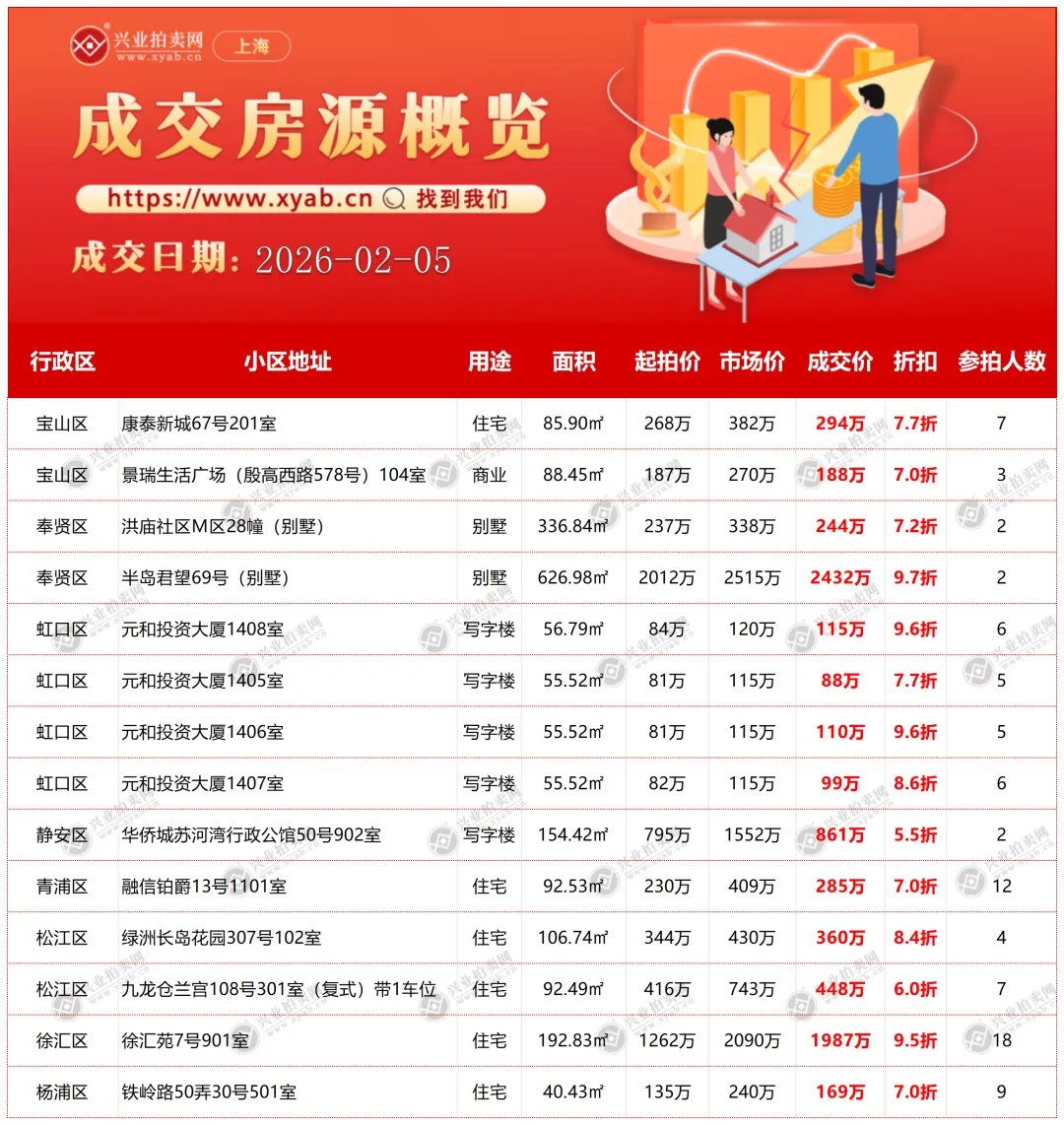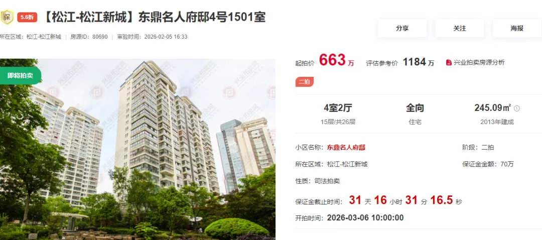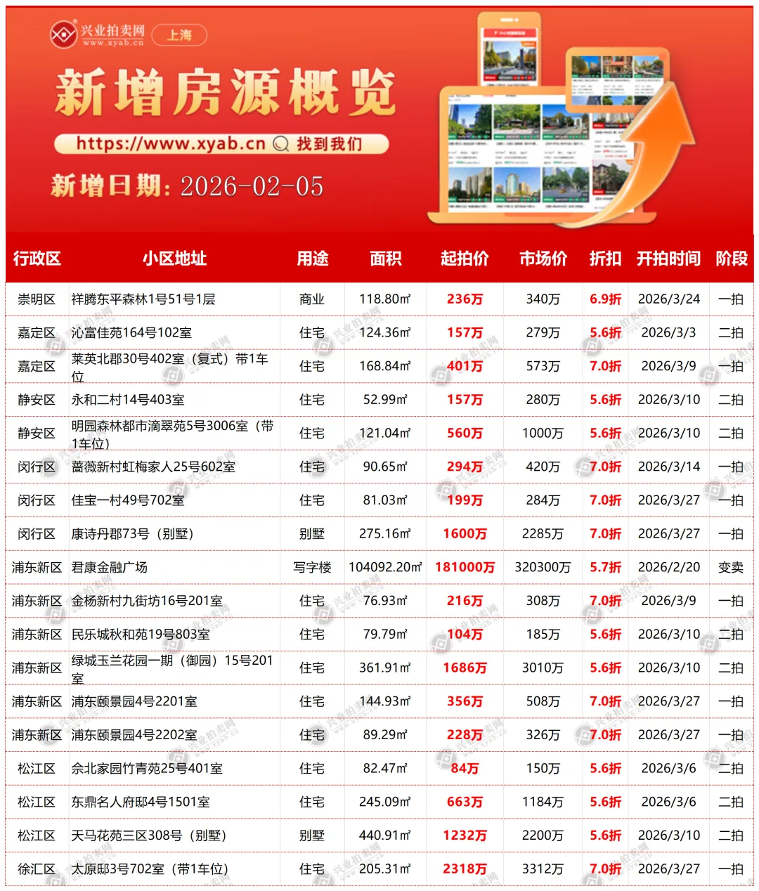 兴业拍卖|2月6日上海拍卖房产简报:新增18套,东鼎名人府邸5.6折上拍!