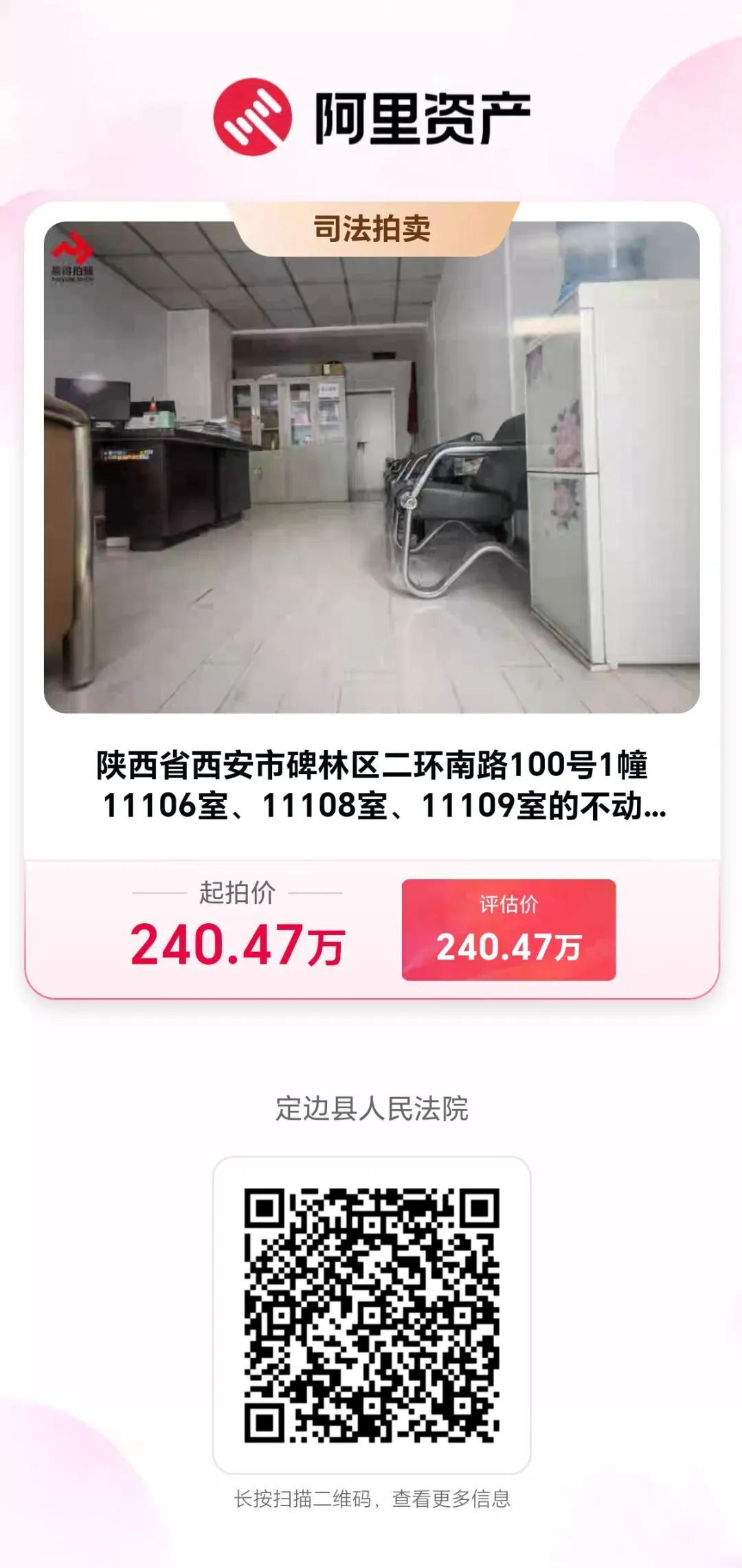 3月5日10时至6日10时,定边法院将在淘宝网司法拍卖平台上,拍卖西安市碑林区二环南路房产,240万元起拍!
