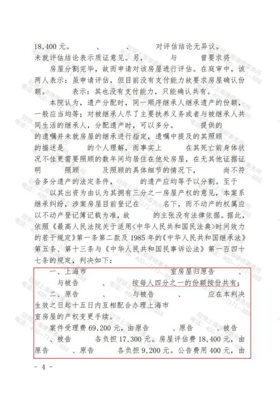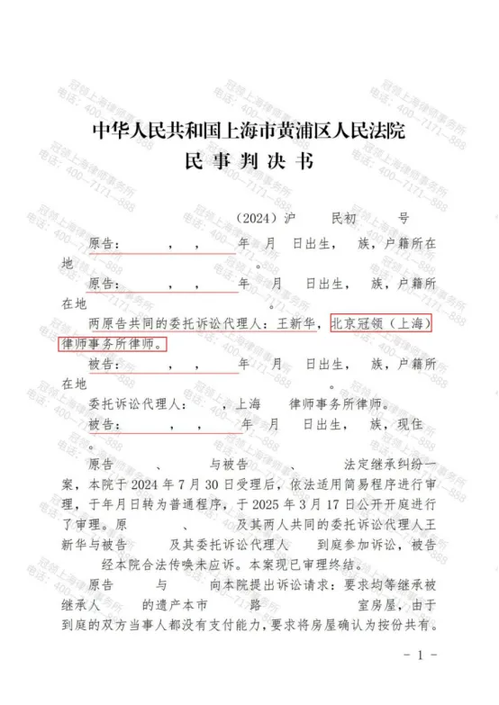 上海黄浦黄家四兄妹因分割母亲房屋问题未达成一致意见,其中两人委托北京冠领(上海)律师事务所律师代理起诉维权。近日,在冠领律师的代理下,法院作出判决,案涉房屋由四方均分,委托人达成继承心愿。