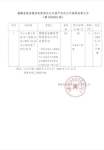 >福建省经协集团有限责任公司房产对外公开招租结果公示(第2026002期)