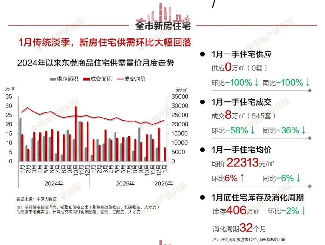 首先我们来看一下东莞1月楼市表现,根据中原地产研究院数据显示,2026年1月东莞一手住宅成交约645套、8万㎡,同比下滑35%和下滑36%。成交量处于历史同期最低水平,受春节影响,较去年同期减约3成,连续四年稳中缓降。东莞1月一手住宅网签均价约22313元/㎡,同比下滑约6%。处于近6年同期最低,连续5年下跌,略高于2020年同期。