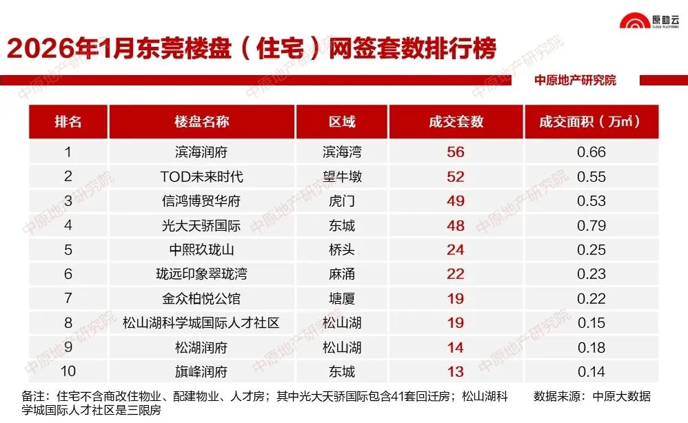根据中原地产研究院显示,2026年东莞1月新房成交前三名的分别是滨海湾新区的滨海润府望雲(56套)、望牛墩的TOD未来时代(52套)和虎门的信鸿博茂华府(49套)。