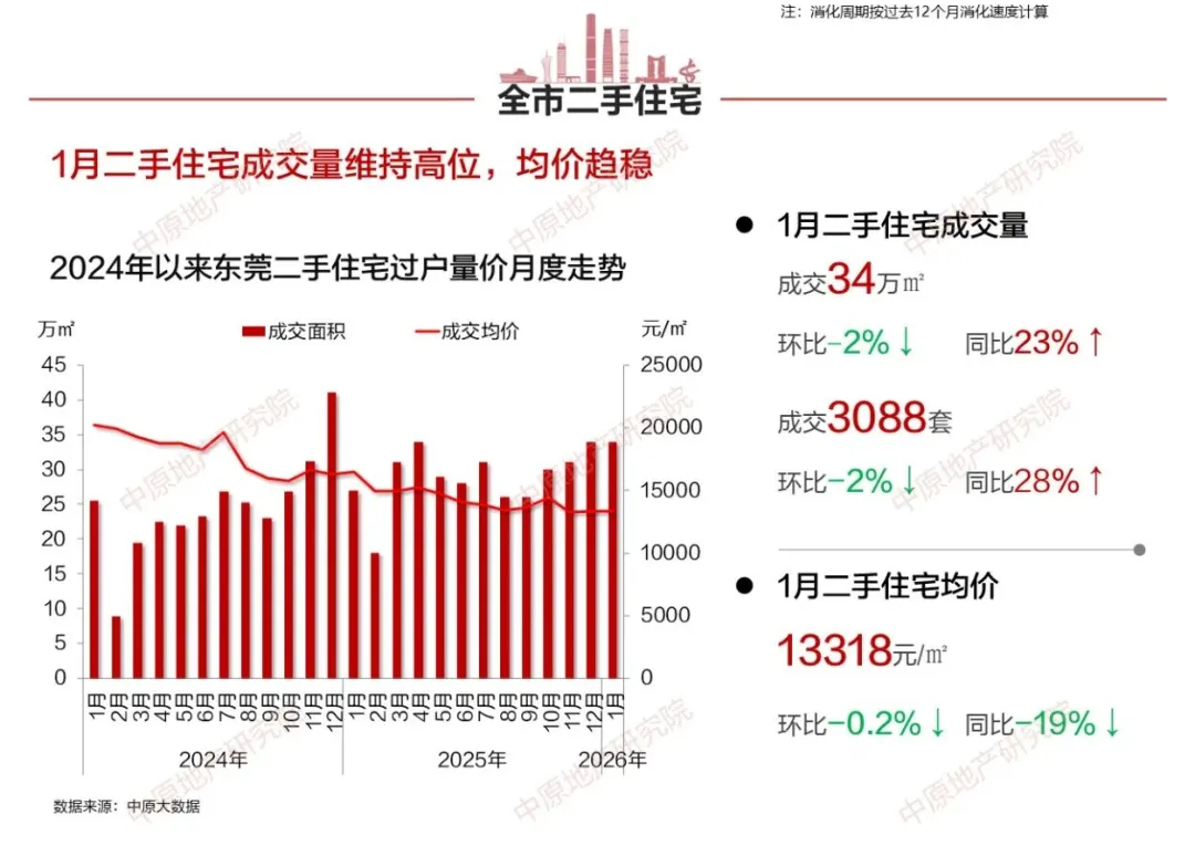 根据中原地产研究院数据显示,2026年1月东莞二手住宅成交约3088套、34万㎡,同比上涨28%和上涨32%。无论是成交套数还是成交面积量都遥遥领先新房。