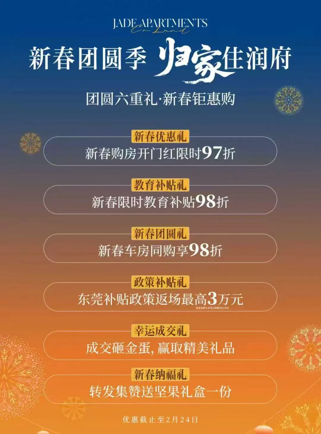 新春置业季,松山湖的松湖润府以诚意回馈全城,特别推出新春六重礼福利,即日起-2月24日期间,签订购房可享受限时97折和限时教育补贴98折,车位和房子一起购买也能享受到98折,还有东莞政策补贴的3万元,成交砸金蛋送礼品,转发集赞还能送坚果礼盒一份。