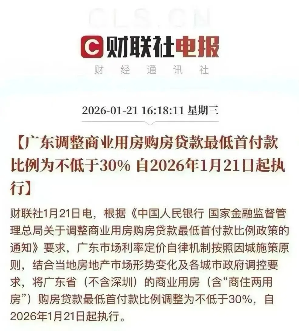 在1月21日,中国人民银行广东省分行发文表示,自2026年1月21日起,商业用房购房贷款最低首付款比例统一调整为不低于30%。各商业银行可在不低于上述政策下限的基础上,根据市场化、法治化原则,结合自身经营状况和客户风险情况,自主确定每笔贷款的具体首付款比例。这也直接说明了买商业房门槛降低,成本也降低了。有利于刺激促进楼市的成交量。