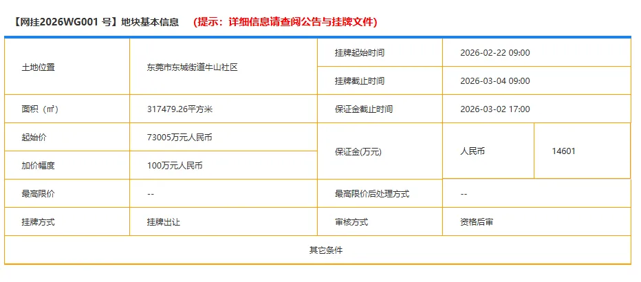 2026WG001号地块,起始价约7.3005亿元,将于2026年3月4日正式开拍。地块位于东城街道牛山社区,占地面积约31.7万㎡,是妥妥的“巨无霸”地块。其总建筑面积约28.57万平方米,容积率仅为0.9,出让年限40年。
