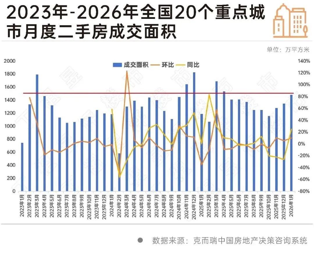 2026年1月,在传统楼市“淡季”,20个重点城市二手房成交面积环比上涨10%。
