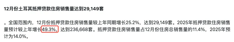 > 信贷端释放信心信号:2025年抵押贷款购房成交同比激增49.3%,直观反映出土耳其本地购房购买力正迎来强势复苏。