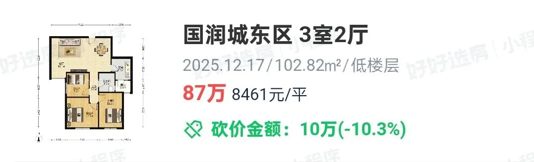 远的不说,就拿国润城不远处的天地源兰樾坊举例。天地源兰樾坊这个小区114㎡的小三室在2024年10月以151万总价成交,在2025年8月同面积段成交总价在136万,目前通面积段的二手房成交总价基本徘徊在100万左右。就目前花100万买天地源兰樾坊114㎡的房子也并不理性,就以实际得房率来看天地源兰樾坊114㎡的二手房,这个户型实际得房率大概在78%,也就是说100玩实际买到一个89㎡的房子,实际单价约1.12万/㎡。按照这个单价来看,真不如去买融合区的保利或者越秀。