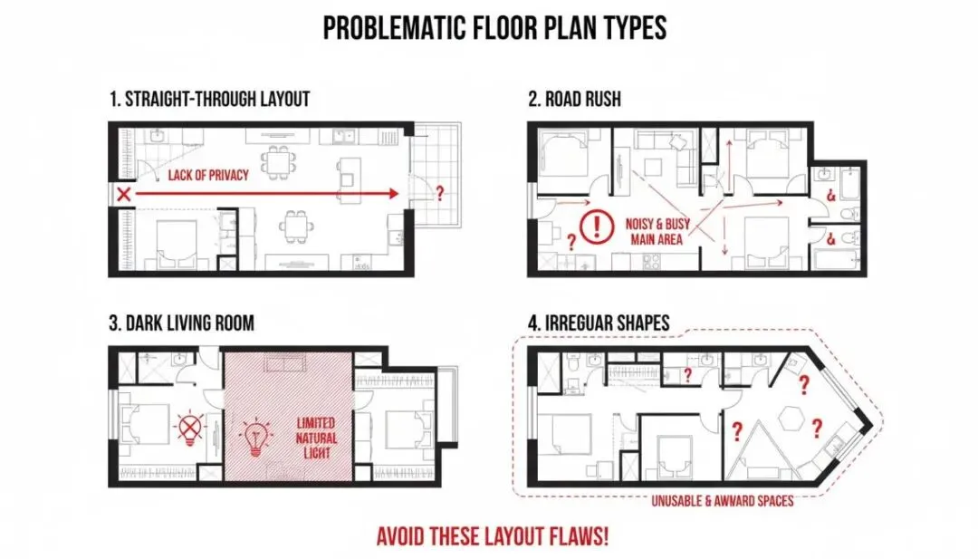 AI生成提示词:Four common problematic floor plan types comparison, clear problem indicators, educational diagram, 16