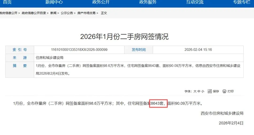 首先看官方数据:西安住建局2月4日公布了1月份西安二手房网签情况,数据显示1月份住宅网签量达到8643套,这是近三年同期最高值。从价格来看,中指院数据显示西安二手房样本均价12987元/㎡,环比下跌1.04%。