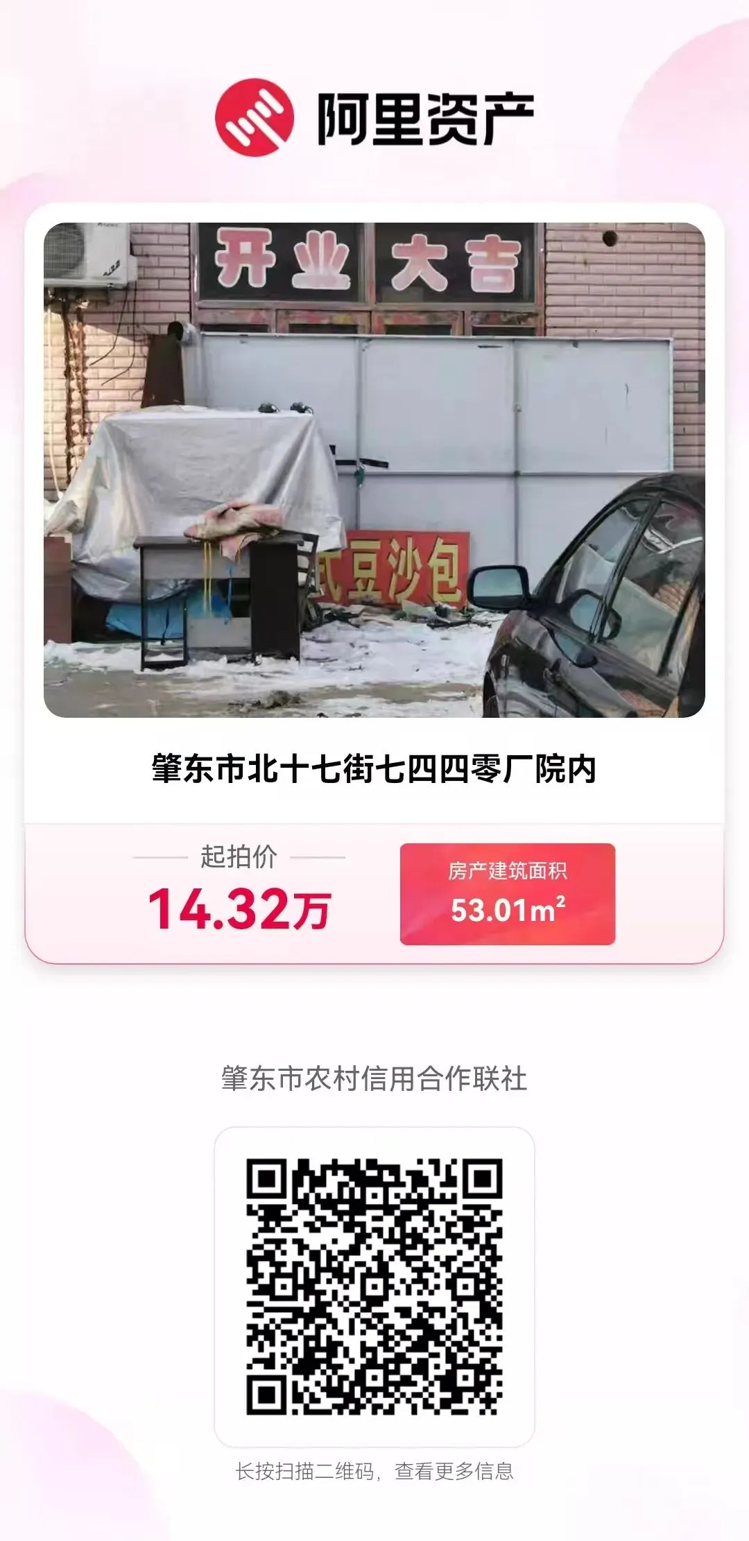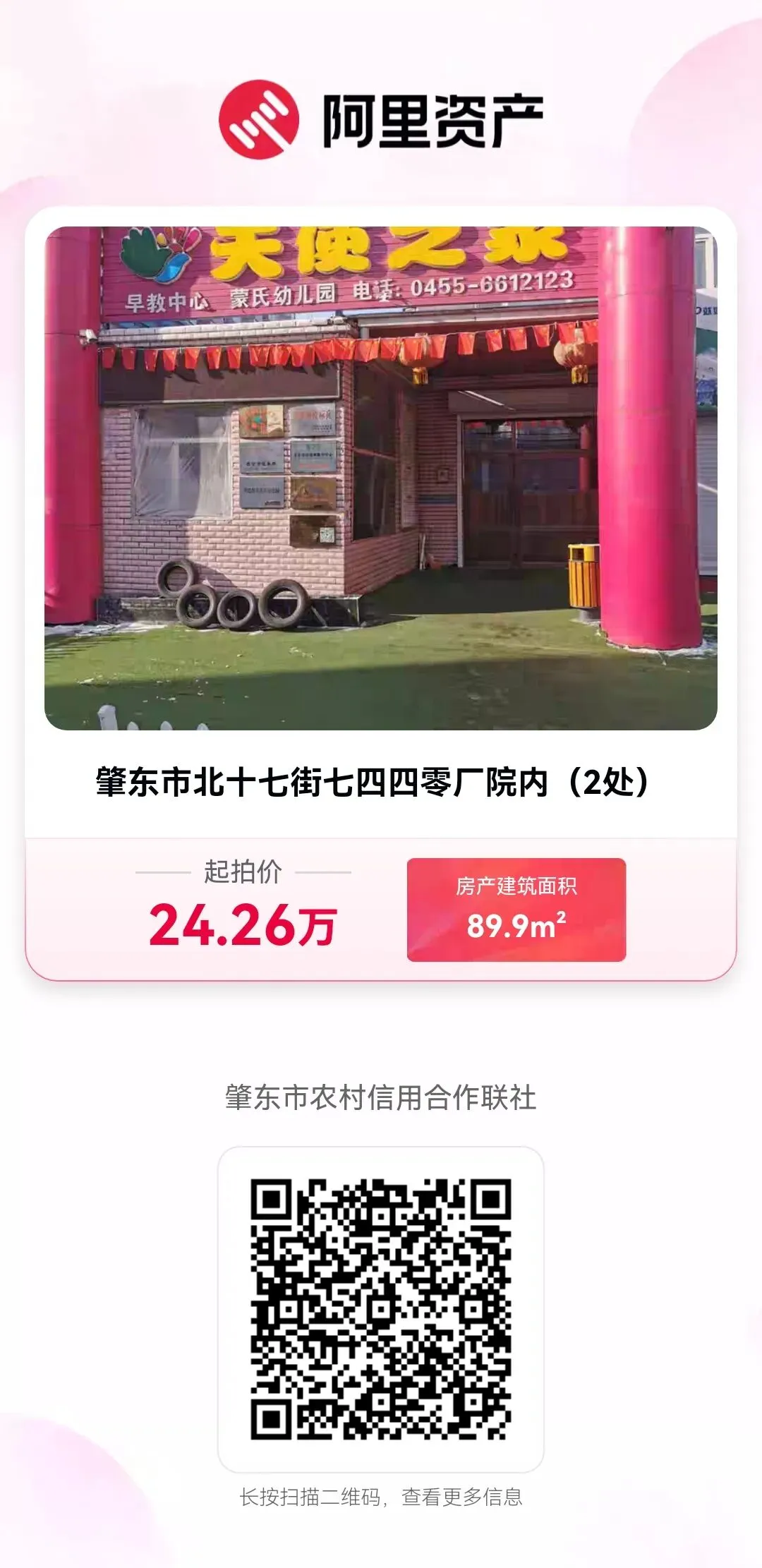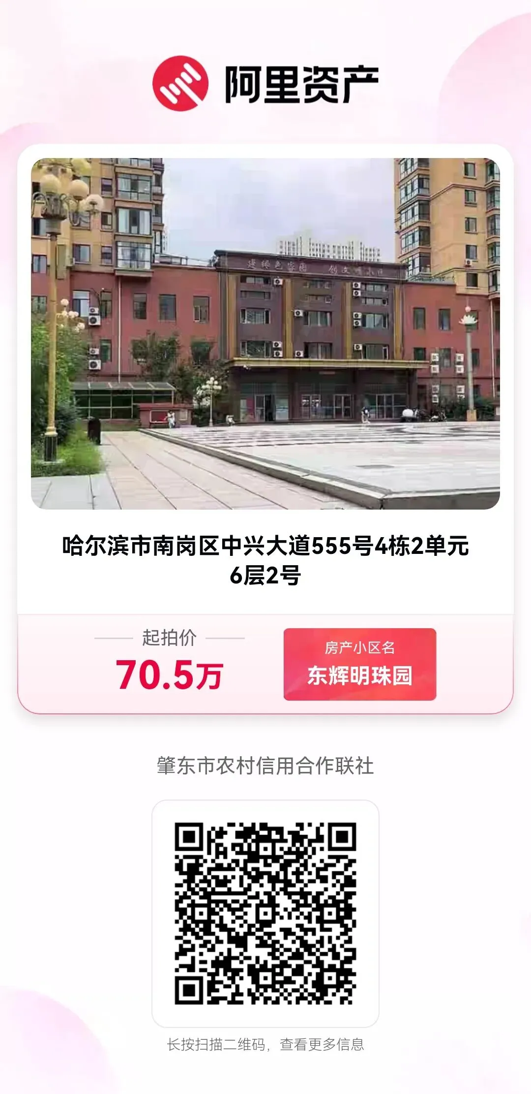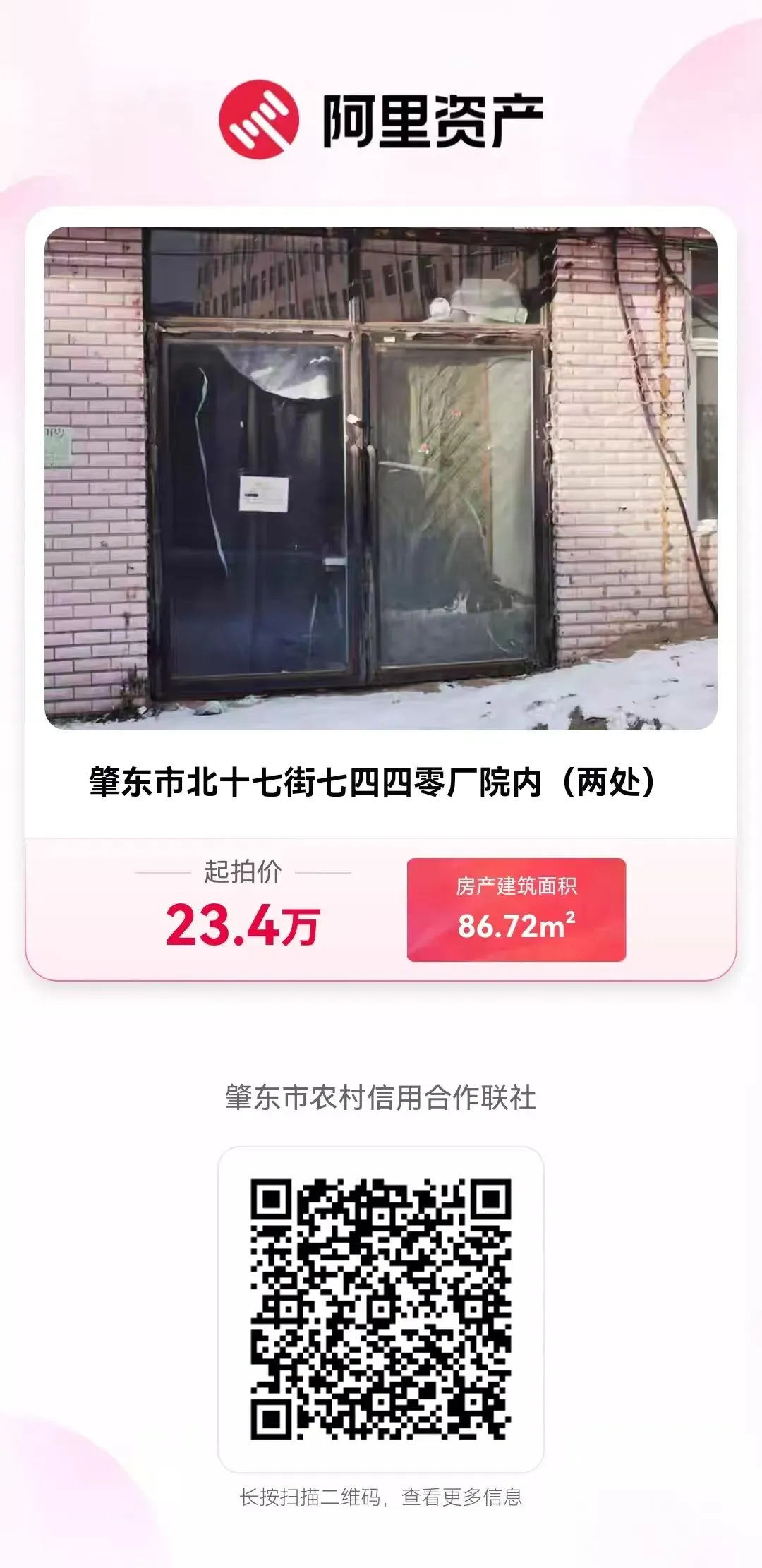 肇东市农村信用合作联社定于2026年2月10日10时至2026年2月21日11时在淘宝网阿里拍卖对房产类抵债资产进行公开竞价出售,资产详情及相关事项请扫描登录平台查询。