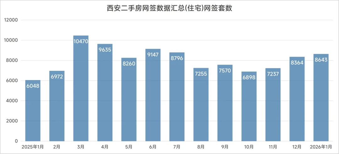 2026年1月,西安全市存量房(二手房)网签备案面积67.13万㎡;其中住宅网签备案8643套,面积90.09万㎡。