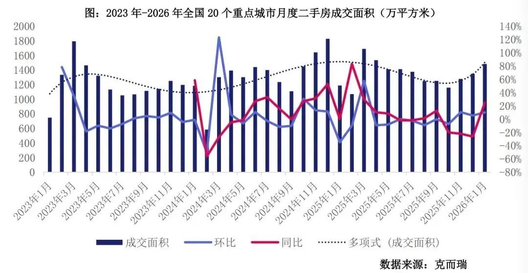 数据显示,2026年1月,重点20个城市二手房成交面积1483万平方米,环比上涨10%,同比上涨25%。