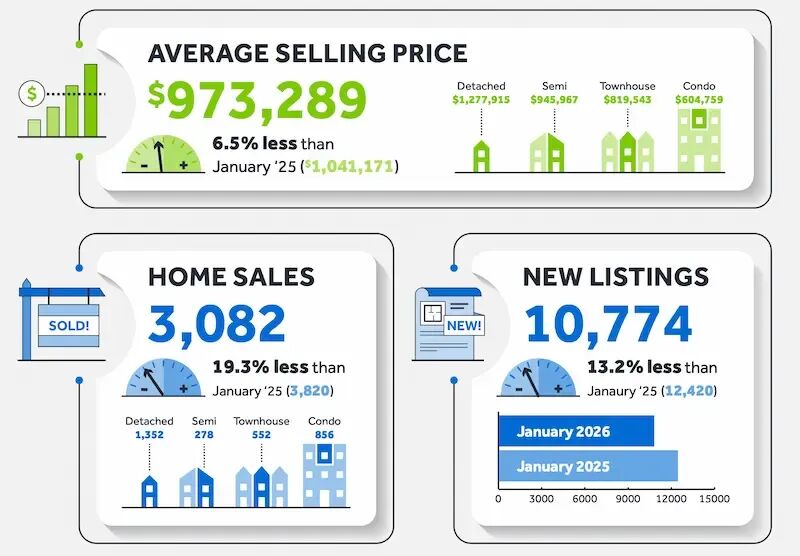 MLS®房屋价格指数(MLS® HPI)综合基准在2026年1月同比下降了8%。平均售价为973,289加元,比2025年1月下降了6.5%。