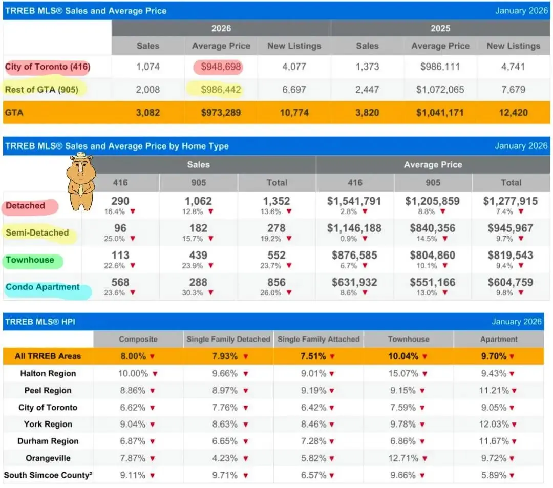2月4日,多伦多地产局公布了 大多伦多2026年1月房产报告 今天咱们一起来回顾一下刚过去的这个月,多伦多的房地产市场发生了哪些变化。大多伦多2026年1月房产报告 官方报告速读