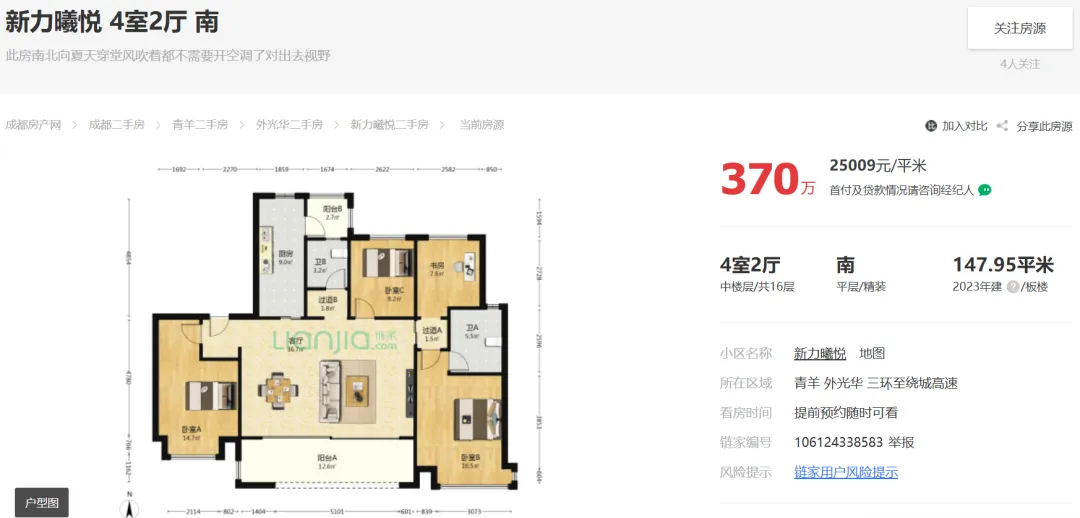 2026年02月05日,据市场端消息:成都青羊外光华,新力曦悦建面148平套四报价370万;目前房东心里价在370万愿意出售。