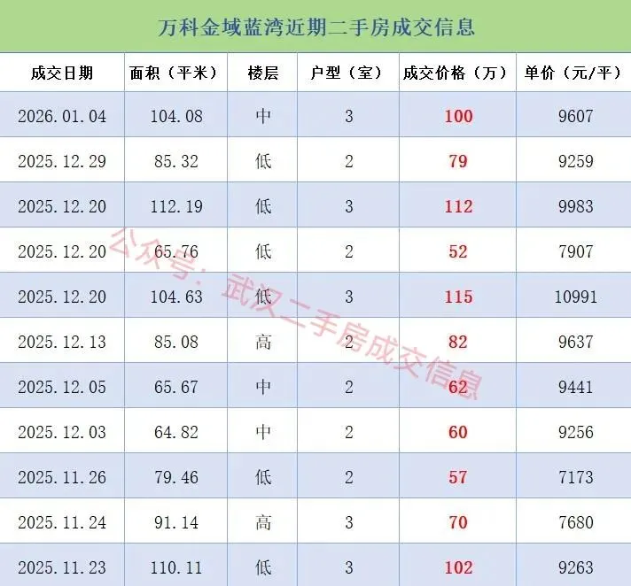 >沌口万科金域蓝湾-近期二手房成交信息,最高115万