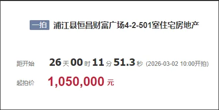 在2025年7月25日浦江县恒昌·财富广场2-2-901室住宅房地产拍卖,以128.478万元成交,据悉:财富广场2-2-901室住宅房地产建筑面积为140.84平米,折合9122元/平米。