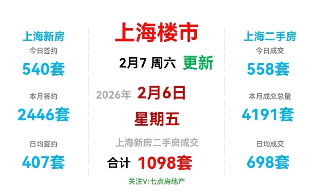 🏠昨日(2月6日,周五),上海新房签约540套,较前一日减少28套(降幅4.93%),日签约面积4.03万m²,套均面积74.63m²。