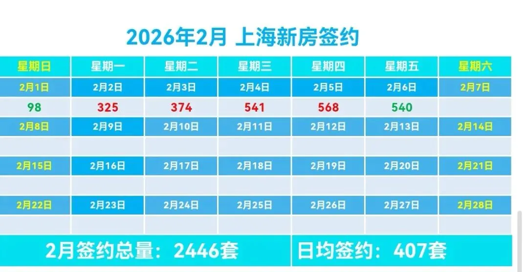 🏠2月上海新房总签约2446套,日均签约407套,本月签约总面积22.09万m²,套均面积92.53m²。