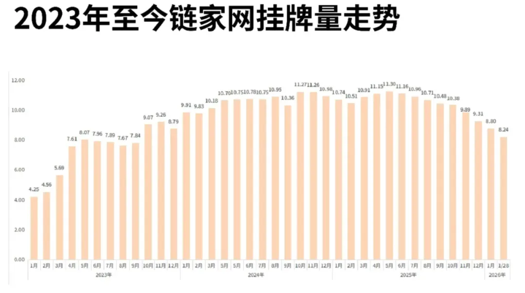更值得关注的是,1月底链家对外展示挂牌量仅为8.24万套,不仅是近九个月最低,更是2024、2025、2026三年来的最低值。