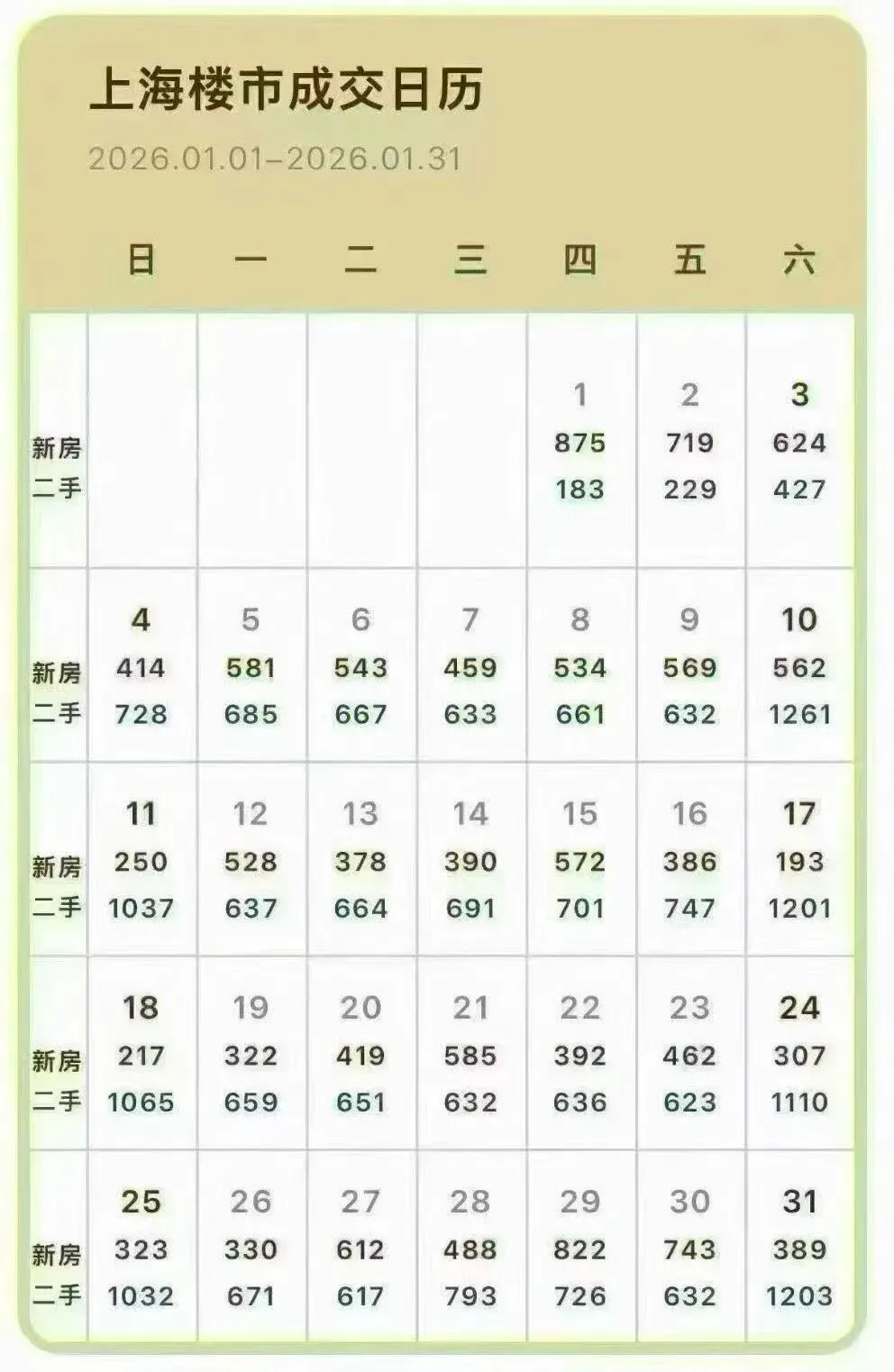 全月日均成交约736套,其中1月第三周(1月12日-18日)成交达5706套,创下自2025年5月至2026年1月期间的单周成交峰值。