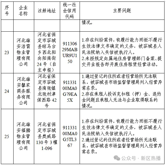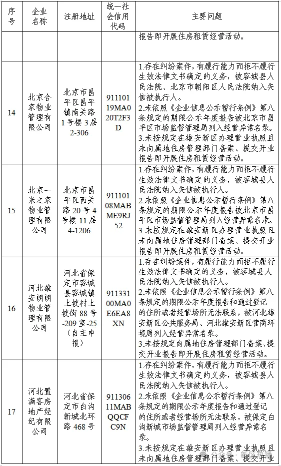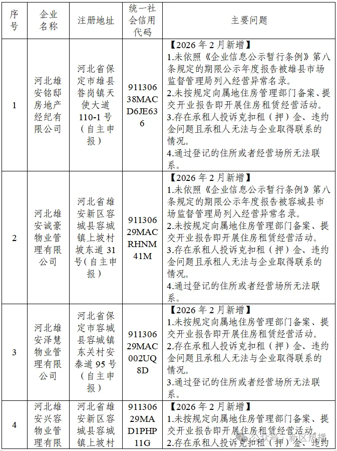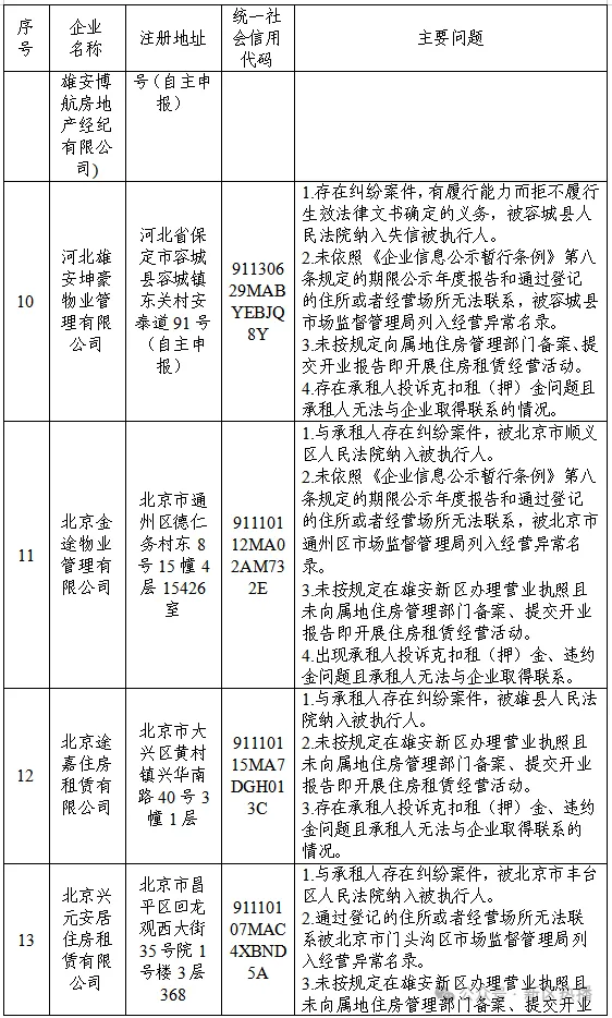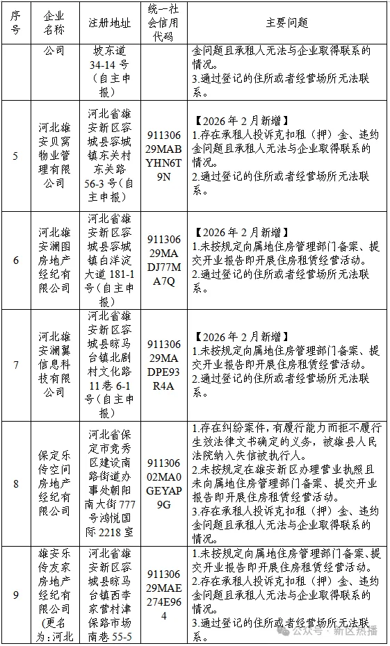 现将雄安新区住房租赁企业、房地产经纪企业风险提示名单公布如下。请广大市民在租房时仔细辨别风险,选择依法合规企业。