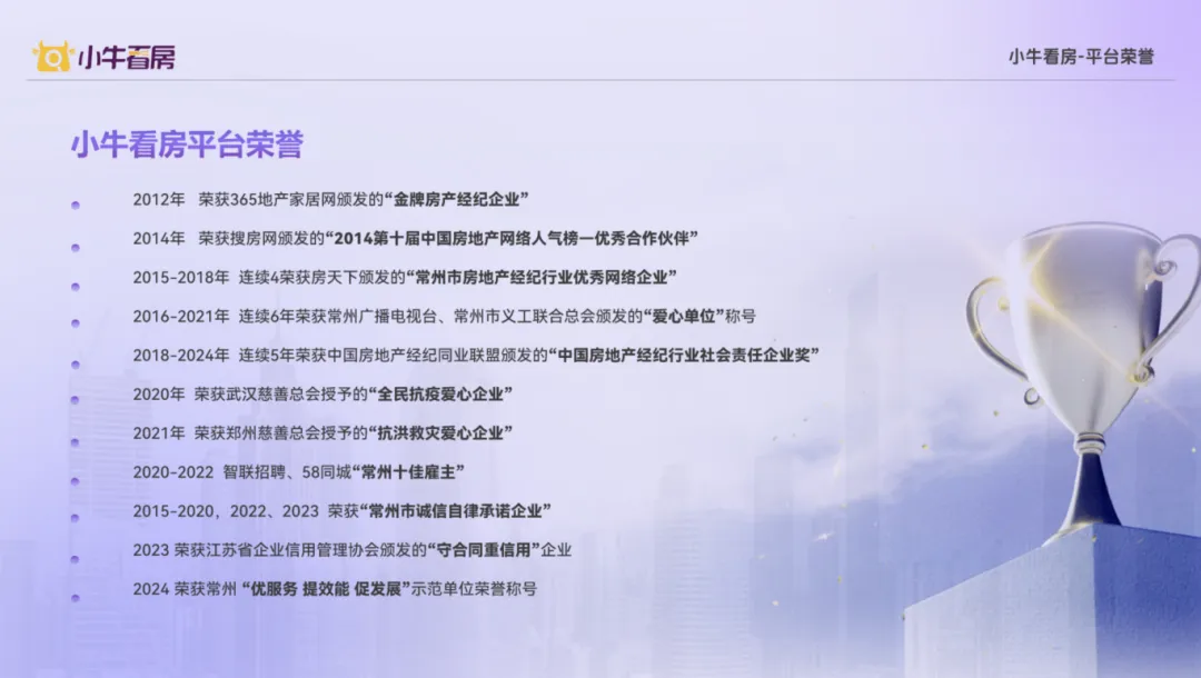 口碑与荣誉:凭借卓越的服务品质,小牛看房屡获市场与行业认可,先后荣获常州“优服务 提效能 促发展”示范单位、2023年度江苏省守合同重信用企业、常州市诚信自律承诺企业等多项荣誉,客户满意度与推荐率长期居于行业前列。