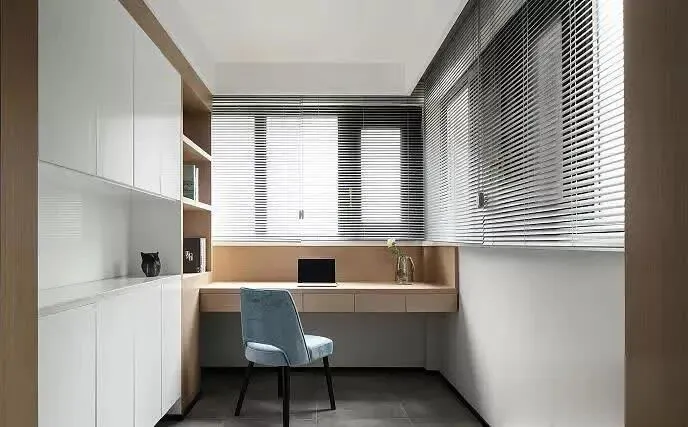 ▲新改造的入户花园。进门左手定制收纳鞋柜,满足进门鞋子的随手收纳,靠近窗户位置定制悬空书桌,局部镂空满足书籍的放置,白色与木色视觉清新,这里就是一个单独的书房区域,透光百叶帘进门光线更好,整体提升了一个档次。