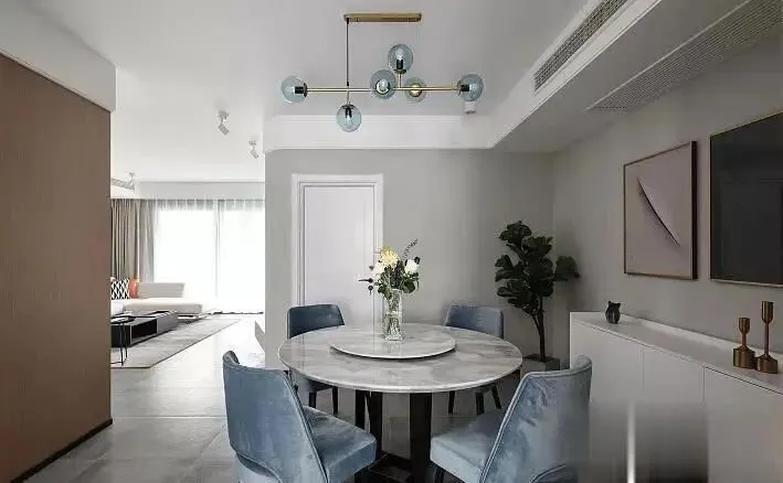 ▲餐厅完工实景。砸掉入户花园与餐厅的门洞,借光入室,这样餐厅光线得到提升,同时视觉更加开阔,灰色的乳胶漆墙面与地面瓷砖一体,局部采用KD板提升空间温馨度;大理石圆形餐桌搭配四把丝绒餐椅,旁边白色的餐边柜,金边挂画与灯具呼应,有质感又有温度。