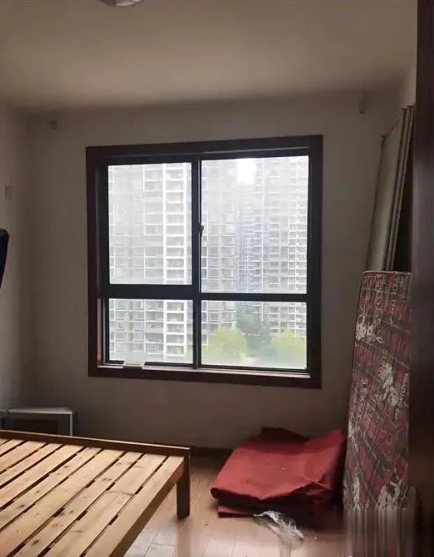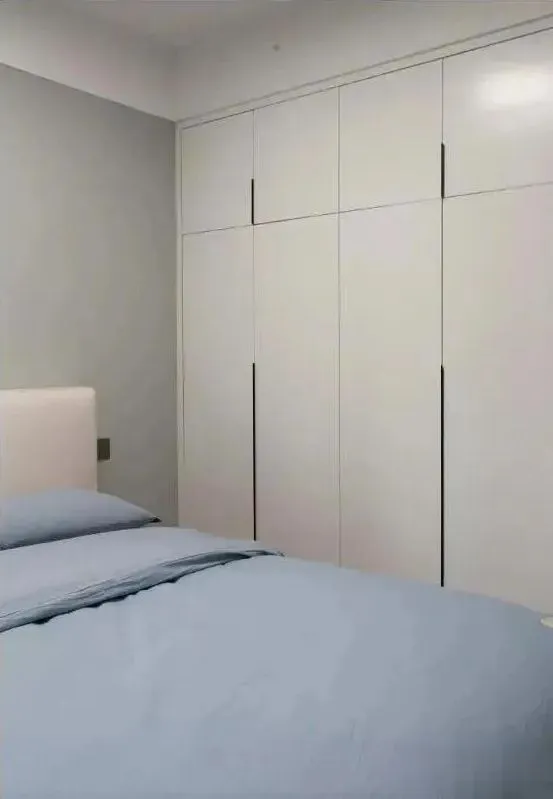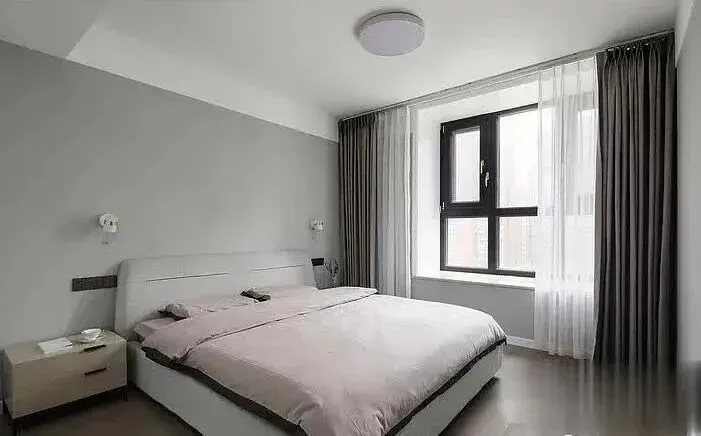 ▲完工后北边小卧室。进门直对就是镶嵌衣柜,满足收纳,背景高级灰变色,白色的高靠背床搭配,素雅窗帘,简单吸顶灯,空间不大,但是暂时布置成卧室,来人都可以入住。原来开发商的窗户都做更换,纯黑色的断桥铝,金色的执手,好看也有质感。