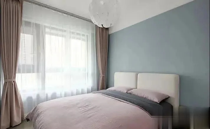 ▲次卧全景。同样更换成了新式窗户,背景蓝灰色变色,同样米色的高靠背床搭配,粉色窗帘与床品布置,非常清新。卧室实在太多,空着也不是个事情,还好家里亲戚比较多,都布置好,以后来人都可以入住。