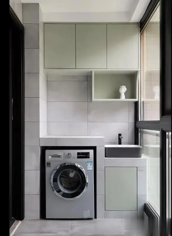 ▲新装修以后的阳台空间。砸掉原来的瓷砖,重新铺灰色系瓷砖,更换移门以及窗户统一黑色质感;砖砌洗衣柜满足洗衣机,旁边台上盆满足平时洗个小件衣服的需求,灰绿色的吊柜定制,满足杂物收纳。因为是客厅阳台,这里不晾衣服,在次卧外面阳台设置晾衣架,刚好看不到衣服的凌乱。